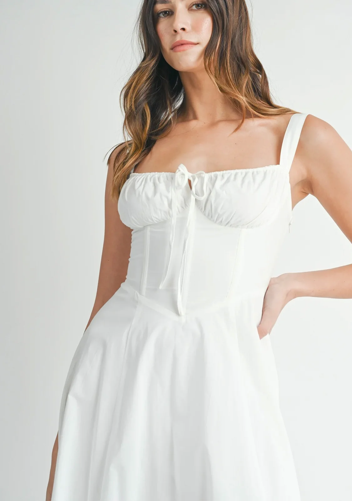 Greet the sunny season in our charming Bustier Bodice Midi Dress, a flattering choice with lovely feminine details.